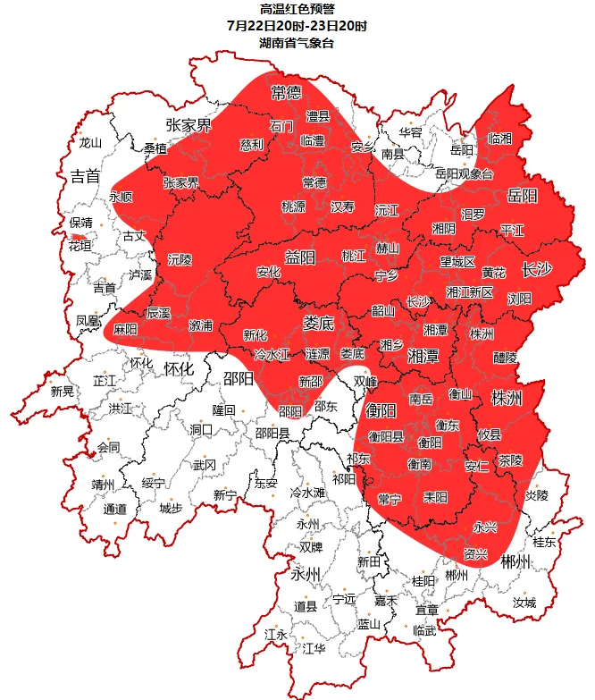 刚刚,湖南省气象台发布了今年首个高温红色预警,预计7月22日20时到23日20时,长沙、株洲、湘潭、衡阳、邵阳东北部、岳阳、常德、张家界、益阳、郴州北部、怀化北部、娄底大部、湘西土家族苗族自治州东北部将出现39℃以上高温,局部地区将达40℃以上,请大家做好防范。