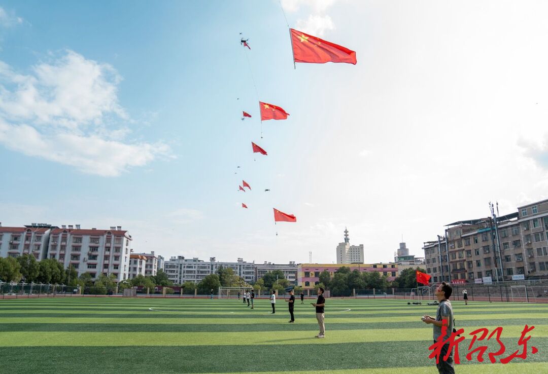 新邵东客户端10月1日讯(记者 张平华)9月29日下午,邵东摄协无人机航拍专业委员会组织30多名航拍爱好者,来到邵东体育馆开展“无人机载国旗升空 深情祝福献祖国”活动,用自己的方式庆祝中华人民共和国成立75周年。