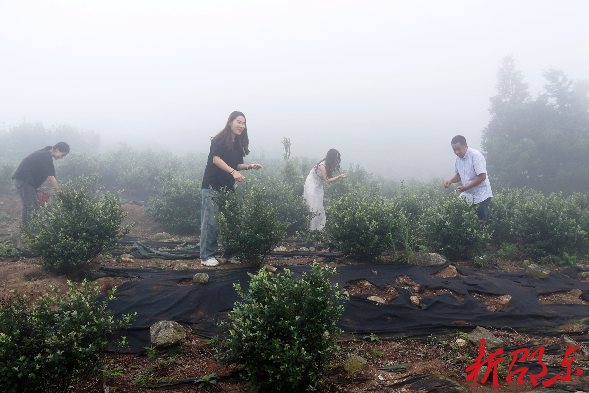 虽然天空下着蒙蒙细雨,但是游客采摘蓝莓的热情不减。在云雾缭绕的大云山巅,一棵棵蓝莓树上挂着饱满的果实,蓝色的外衣上还裹着一层薄薄的白色果粉,色泽诱人、芳香四溢。一些游客一边欣赏美景,一边采摘品尝蓝莓,并连连点赞:“这蓝莓酸酸甜甜的,像初恋的感觉,真好!”