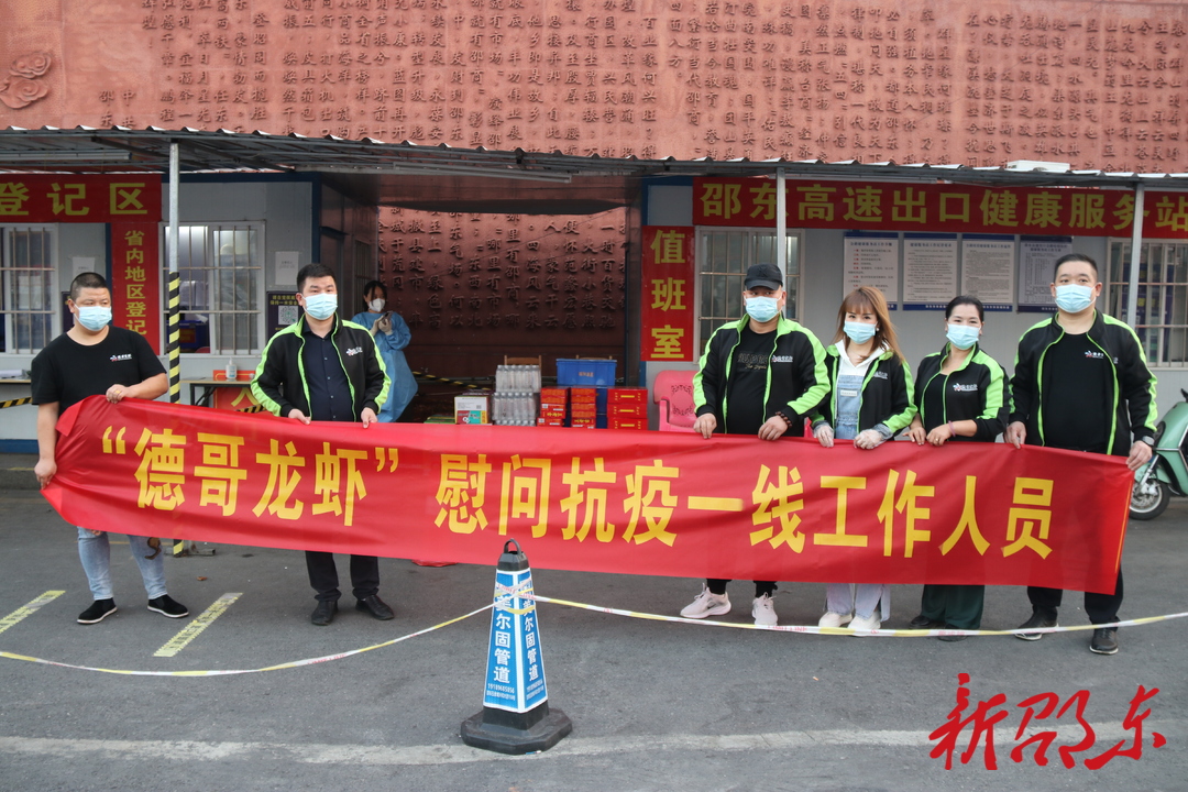 新邵东客户端10月23日讯(记者 张平华)10月22日,爱心餐馆——德哥龙虾向邵东高速出口健康服务站的防疫一线工作人员捐赠矿泉水、王老吉、方便面和半个月的爱心晚餐,价值1.5万元,以实际行动表达对防疫一线人员的慰问和感谢,践行社会责任与担当,传递防疫正能量,助力疫情防控工作。