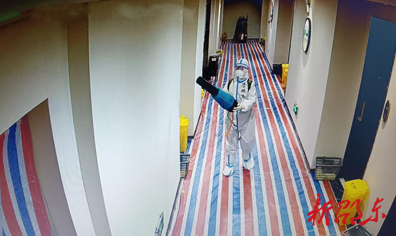 新邵东客户端10月31日讯(记者 张平华 通讯员 杨晓星)10月30日,在邵东市阿富尔万国酒店隔离点,李雅琴身着防护服,背着近百斤的消杀设备,正认真地对隔离点内的每一个角落进行消杀。